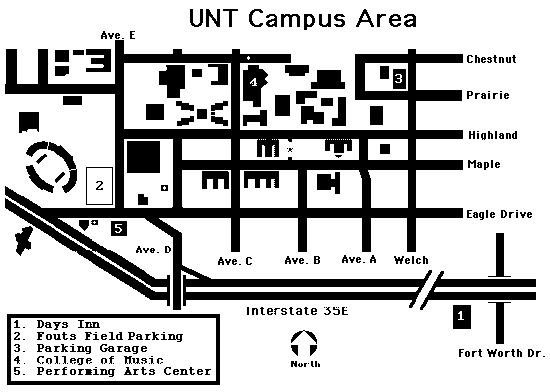 Parking: Parking is available in two locations on campus. A parking garage is located on Welch street, east of the University Union building. Rates for the parking garage are $1.15 per hour or $6.00 per day. Free visitor parking is available in the Fouts field parking lot on Avenue E. A shuttle bus is available to locations close to the College of Music building, however, this parking lot is only a 2-3 block walk to the Music Building (but uphill). For the Friday session, some may find the parking garage more convenient (for special accommodations, please see the UNT Service Officer at the information booth located in the Fouts Field parking lot). For the Saturday session, the Fouts field parking will be immediately adjacent to the Performing Arts Center. Note: for those of you familiar with Denton and UNT, Avenue C is now closed to through traffic adjacent to Campus between the hours of 8:00 a.m. and 3:00 p.m., Monday through Friday. The most convenient access to the UNT Campus is via the Avenue D exit on I-35e, which has been rerouted to make a direct connection to Avenue E (see map below).